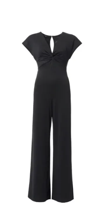 Wat direct opvalt aan dit specifieke ontwerp is de ingenieuze knoop op de borst, die zorgt voor een prachtig geplooid effect. Dit detail geeft de jumpsuit een luxe uitstraling die we normaal gesproken alleen zien bij de duurdere modehuizen in de grote steden. De korte mouwen vallen soepel over de schouders, terwijl de diepe v-hals precies genoeg blootgeeft voor een vrouwelijke en elegante verschijning. De achterzijde is voorzien van een subtiele opening met een knoopsluiting, wat een speels element toevoegt aan het geheel van deze donkere kledingcombinatie.