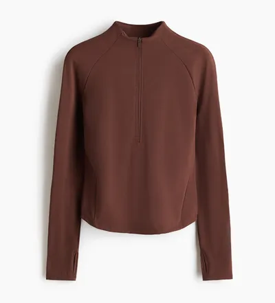 Maar voor iedereen die liever niet alleen in een sport-bh door de sportschool paradeert (of het gewoon nog een beetje fris vindt), is er de bijpassende sporttop. Dit is geen basic shirt. De opstaande kraag met rits geeft het een chique, put-together look, terwijl de extra lange mouwen met duimopeningen zorgen voor het ultieme cozy gevoel. Ze houden je handen warm en de mouwen perfect op hun plek tijdens je stretches. Het is de ideale top voor je warming-up, voor pilates of om snel aan te trekken voor die koffie-to-go na je workout.