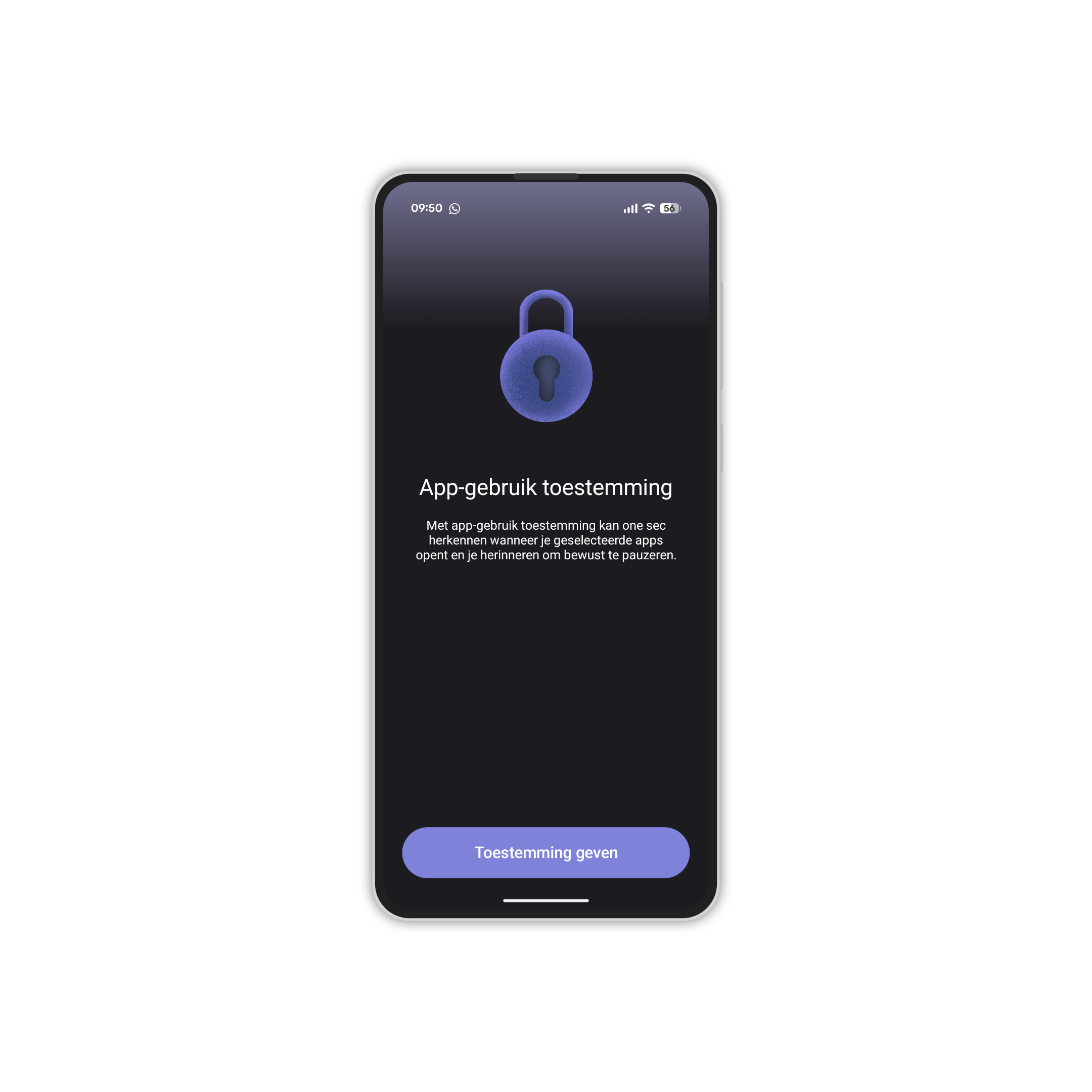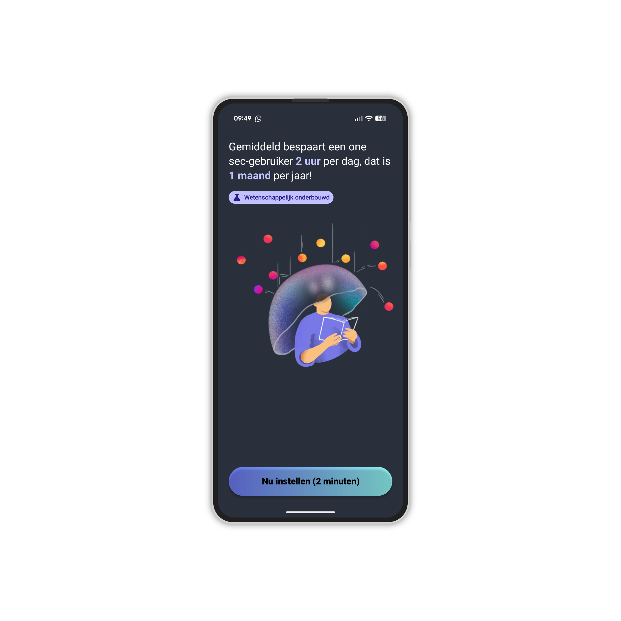 De app One sec is ontworpen met het doel automatisch scrollgedrag op je smartphone te doorbreken. Het onderscheidt zich door een bewuste pauze af te dwingen wanneer je een (verslavende) app opent. In plaats van direct te laden, presenteert one sec een korte ademhalingsoefening. Daardoor krijg je even de ruimte om de muscle memory van de handeling te onderbreken. Ook krijg je hierdoor de kans om een weloverwogen beslissing te nemen over wat je echt wilt doen, in plaats van onbewust in een app te verdwijnen.