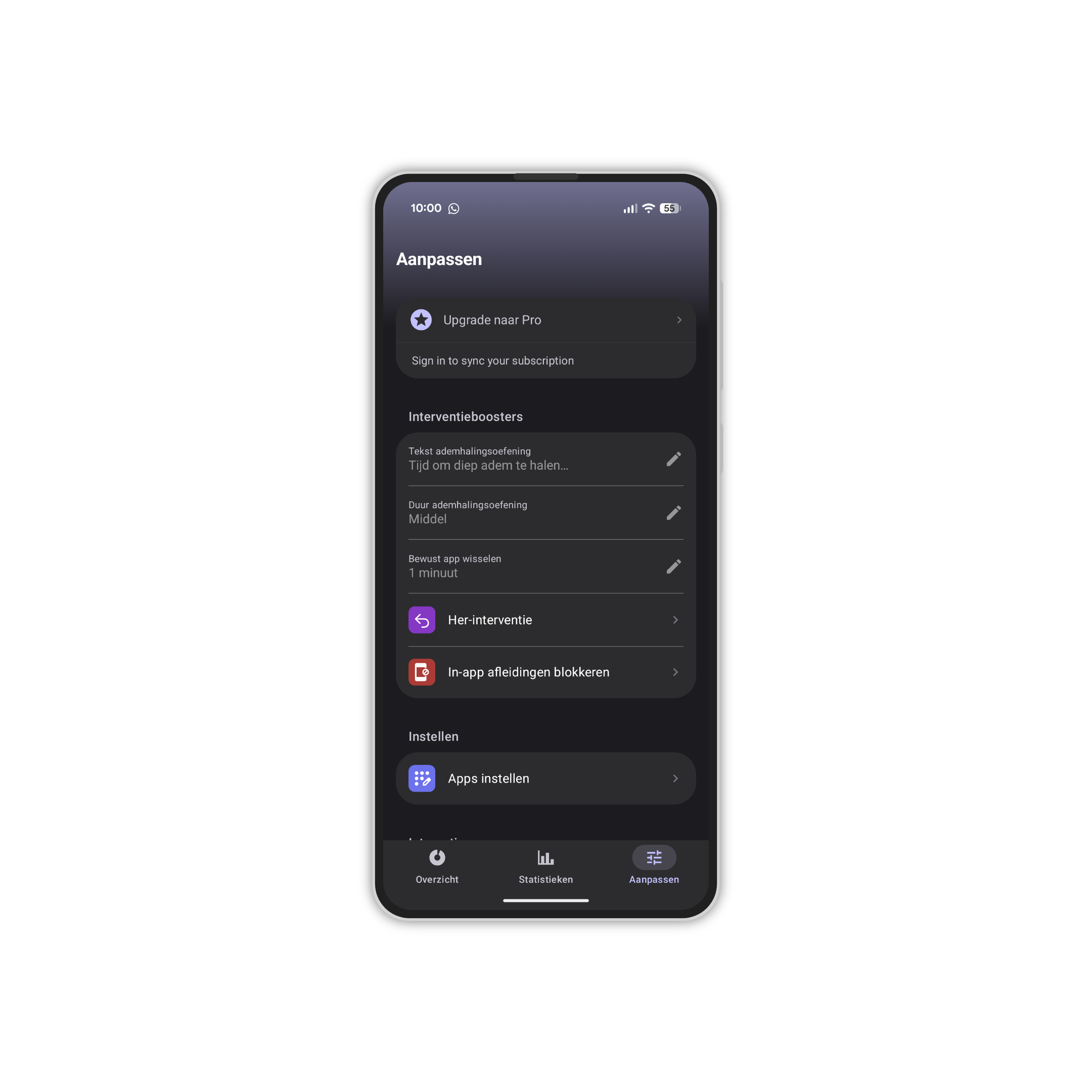 Onderin beeld staan drie tabbladen binnen One sec. Met Aanpassen kun je de ervaring verfijnen. Je kunt de ademhalingstekst wijzigen, de duur van de oefening aanpassen en de slimme Herinteverntiefunctie instellen. Die laatste zorgt ervoor dat je na een tijdje gebruik opnieuw een pauze moet nemen, wat lange scrollsessies effectief doorbreekt. Een andere krachtige tool is In-app afleidingen blokkeren, waarmee je specifieke, verslavende onderdelen zoals Instagram Reels of YouTube Shorts kunt tegengaan, terwijl de nuttige functies van de app bruikbaar blijven.
