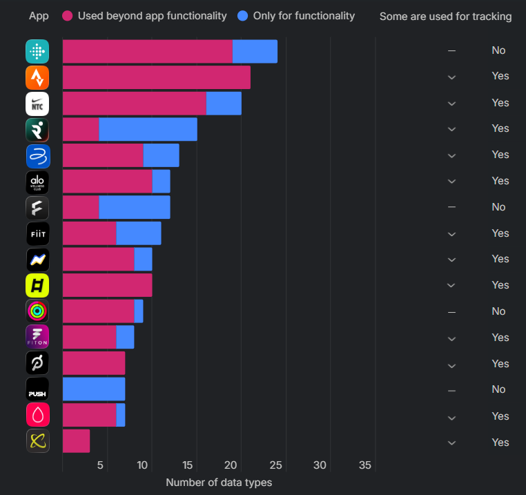 In een rapport van Surfshark komt naar voren dat vooral Fitbit en Strava laag scoren op de privacy van gebruikers. Er werd gekeken naar 35 verschillende soorten data verdeeld over 16 categorieën (waaronder contactgegevens, gezondheidsdata en locatie) via de App Store van Apple. Wat blijkt? Fitbitt gebruikt enorm meer dan de helft van de datatypes buiten de appfunctionaliteit. Bij Strava is dat zelfs nog meer. Ook Nike’s app doet het niet heel goed. Strava is de winnaar als het gaat om het mogelijk exploiteren van de meeste data buiten de functionaliteit van de app om (voor maar liefst 21 datatypes). Het kan het gebruiken voor zijn eigen statistieken, maar ook productpersonalisatie en marketing.