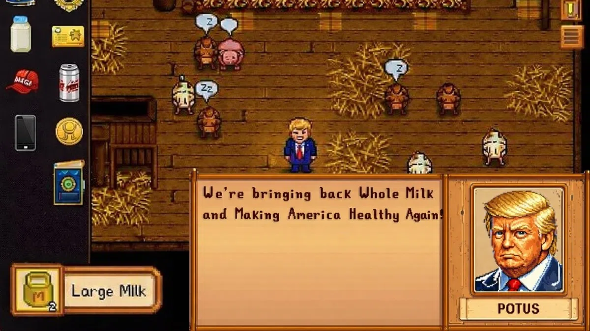 Er is een hoop veranderd sinds Donald Trump aan de knoppen zit in het Witte Huis. Zo ook de socialmedia-accounts van de welbekende ambtswoning. Met enige regelmaat worden daar nu nogal opmerkelijke dingen geplaatst. Zoals een melk-promotende Trump in Stardew Valley.