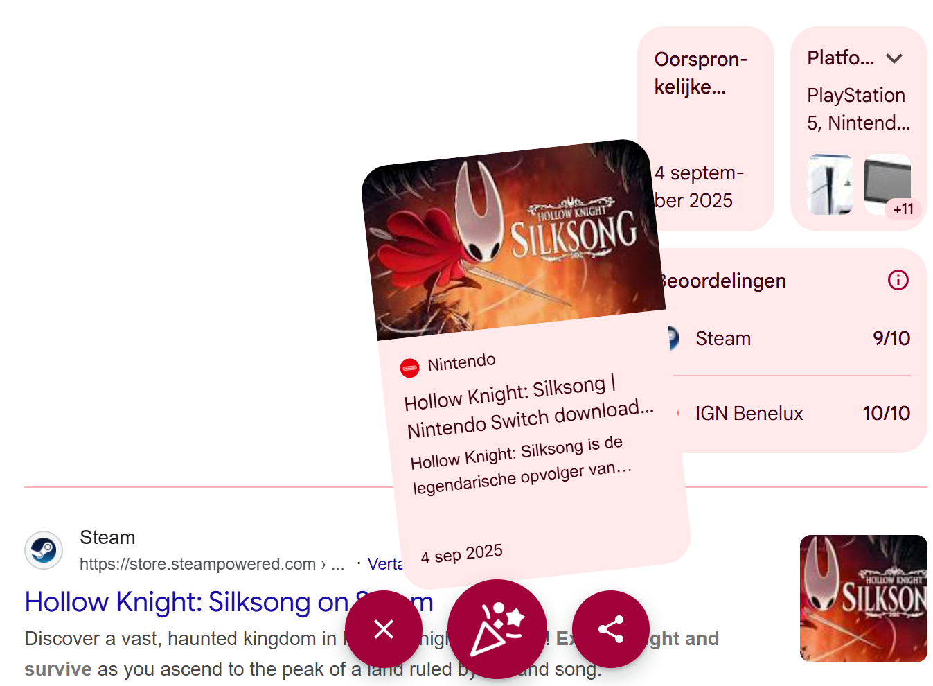 In ieder geval heeft Google wel een leuke Silksong-easter egg om je bezig te houden. Google Silksong in Chrome en je zal merken dat er onderin een rode knop komt te staan met confetti erop. Zodra je die knop indrukt, merk je dat allerlei elementen uit de Silksong-zoekresultaten worden gezwiept. En dat is niet toevallig: de ridder slicet ook alle vijanden en dat is eigenlijk wat je nu ook ongeveer doet. Of nou ja, hier ben je succesvol, in de game is het vooral proberen, want het spel is niet makkelijk.