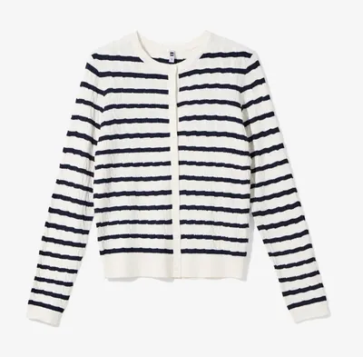 Het warenhuis dat we allemaal kennen van de rookworst en tompoucen heeft zichzelf dit modeseizoen overtroffen. Ze komen namelijk met damesvest Louisa. Dit is een kledingstuk dat direct onze aandacht trok en niet meer losliet. Het is een prachtig wit vest met diepe donkerblauwe strepen. Wat dit exemplaar zo bijzonder maakt en onderscheidt van simpele katoenen shirtjes is de textuur. Het vest is namelijk voorzien van een subtiel kabelpatroon. Dit reliëf geeft het kledingstuk direct een rijke en luxe uitstraling. Het zorgt voor diepte en maakt het net even wat spannender dan een glad gebreid truitje. Het heeft een nette ronde hals en een knoopsluiting die je zowel dicht als open kunt dragen voor een speels effect.