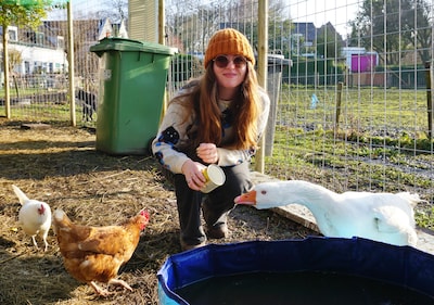 Vijf kippen, twee paarden, één haan, twee varkens en Peter de gans. Je vindt ze allemaal in de Molenweide, een verstopt stukje groen in Hillegersberg. Daar woont ook Maxz van der Hucht (28), die de dieren samen met buurtbewoners verzorgt en hierover vlogt voor haar inmiddels 45.000 volgers.