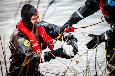 Een meeuw bevond zich donderdagmiddag in een benarde situatie in het water van het Wantij in Dordrecht. Het dier was verstrikt geraakt in visdraad. De brandweer kon de meeuw niet losmaken, dus is er een duikeenheid uitgerukt om de vogel te bevrijden.