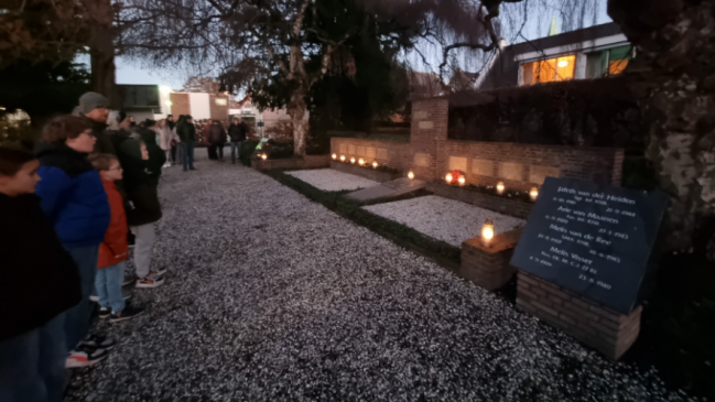 Net als (bijna) overal deze Kerstavond kwamen kinderen en andere belangstellenden om 17.00 uur samen op de Oude Begraafplaats aan de Kerkstraat.Will van Velsen van de Oudheidkundige Vereniging ‘s-Gravendeel vertelde de aanwezigen over twee dorpsgenoten wier namen ook genoemd staan: Henk de Winter en zijn zus Lijsje. Henk was KNIL militair en is gesneuveld in de strijd tegen de Japanse bezetter en Lijsje kwam later om het leven op Ambon.