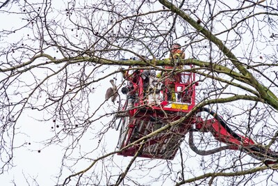 Bewoners van een flat langs de Jozef Oreliosingel in Schiedam keken dinsdagmiddag vreemd op toen zij een meeuw ondersteboven aan een tak van een boom zagen hangen.