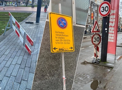 In elkaar gezakte afzethekken, borden met omleidingen van september en pionnen op een willekeurige hoek van de straat: in het centrum van Rotterdam wemelt het van het zwervende afzettingsmateriaal. Hoe kan het dat deze spullen zo lang ongebruikt op straat blijven staan?